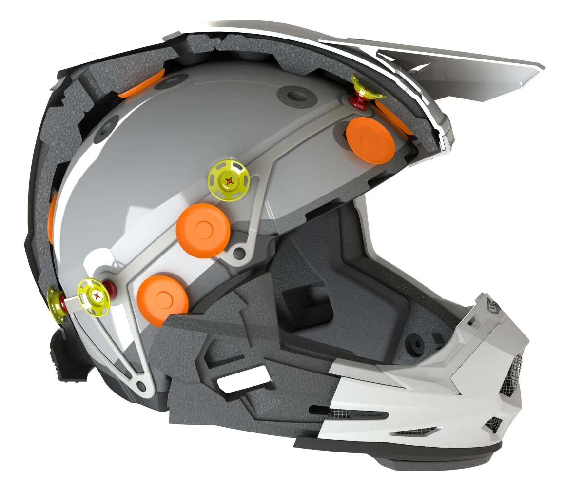 The 6D Youth ATR-2Y Helmet is a kid-sized version of the adult ATR-2 Helmet, infused with the same technology and feature. Influenced by 6D’s work inside the NFL’s Head Health Challenge III Contest, the ATR-2Y has Expanded Polypropylene (EPP) multi-impact outer liner and a replaceable Expanded Polystyrene (EPS) inner liner. As before, the two liners are connected via a series of elastomeric isolation dampers, assisting in progressive loading of the ODS system during impacts. Isolation dampers have been replaced by “damping towers” that are incorporated into the outer liner and capped by low-friction disks that slide freely against the inner liner during impacts providing a freer more effective energy management system. A Cervical Protection Zone works to protect the neck and spine while the ATR-2Y’s shell has been optimized to perform in concert with the Advanced ODS. A Brow Rib strengthens the shell at the eyeport area and the EPP chinbar provides improved impact protection to the jaw area.