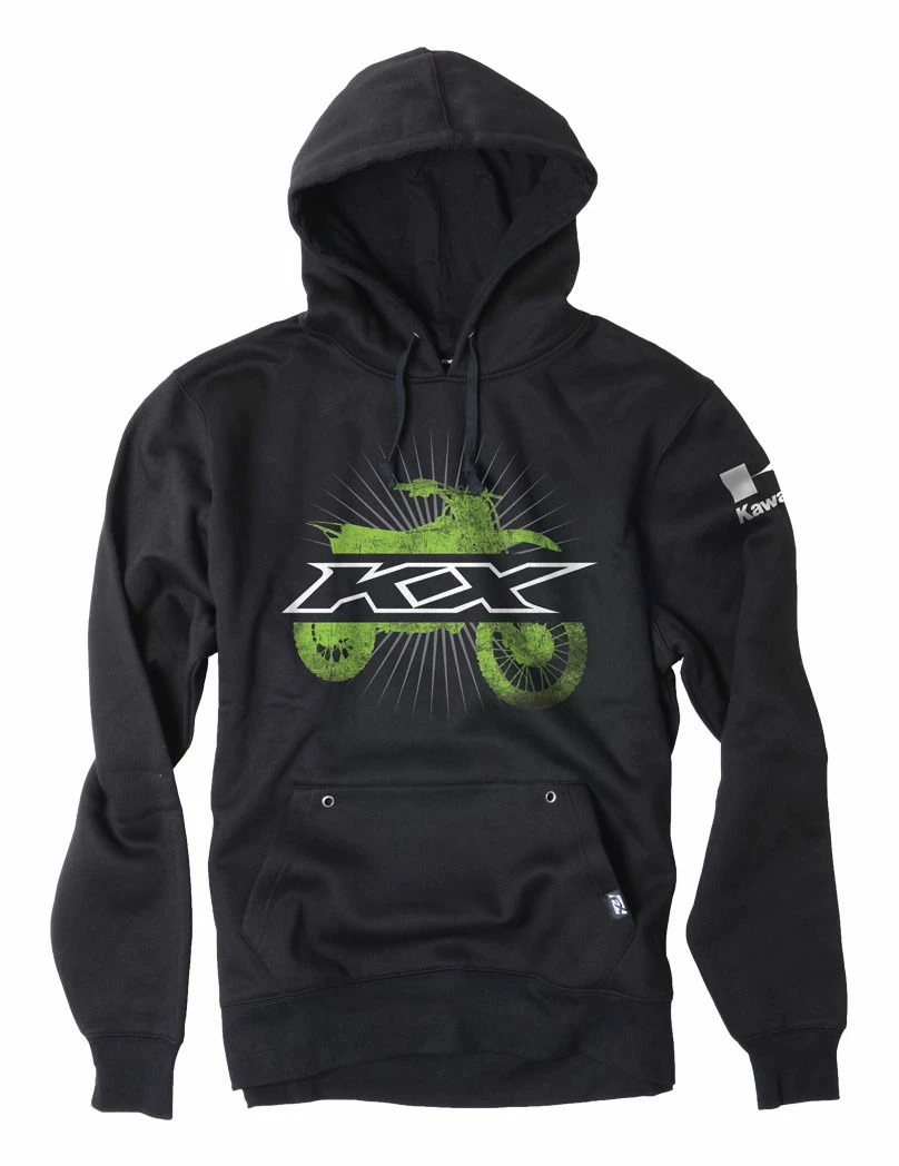 The Kawasaki Pullover Hoodie features black heavyweight fleece construction, with a bike graphic in Kawasaki green on the chest. Official Kawasaki licensed apparel.